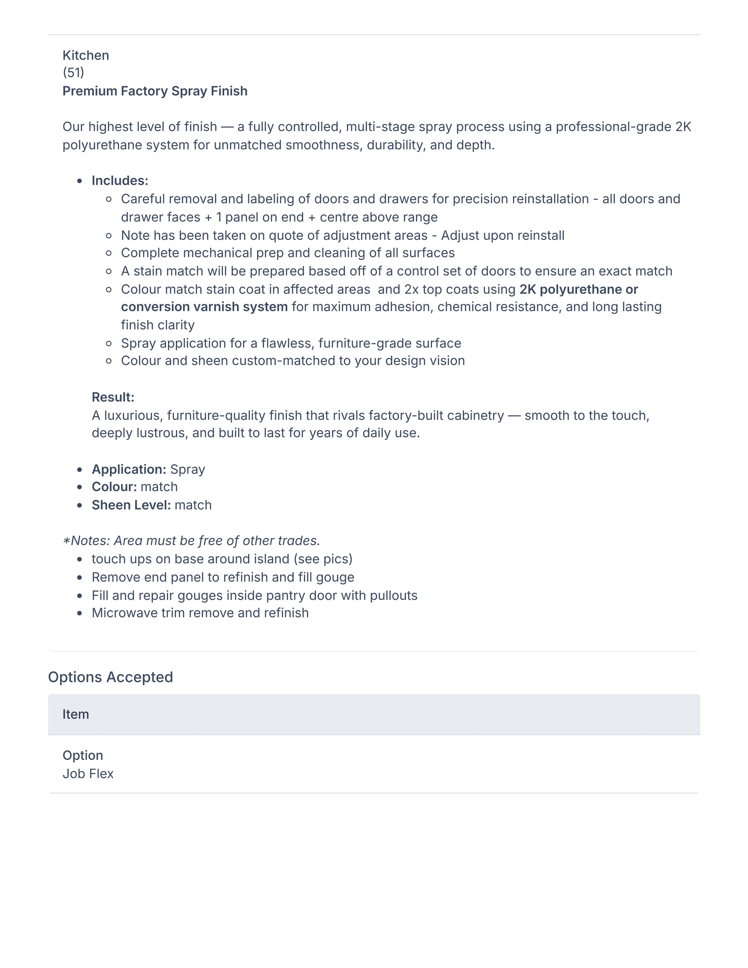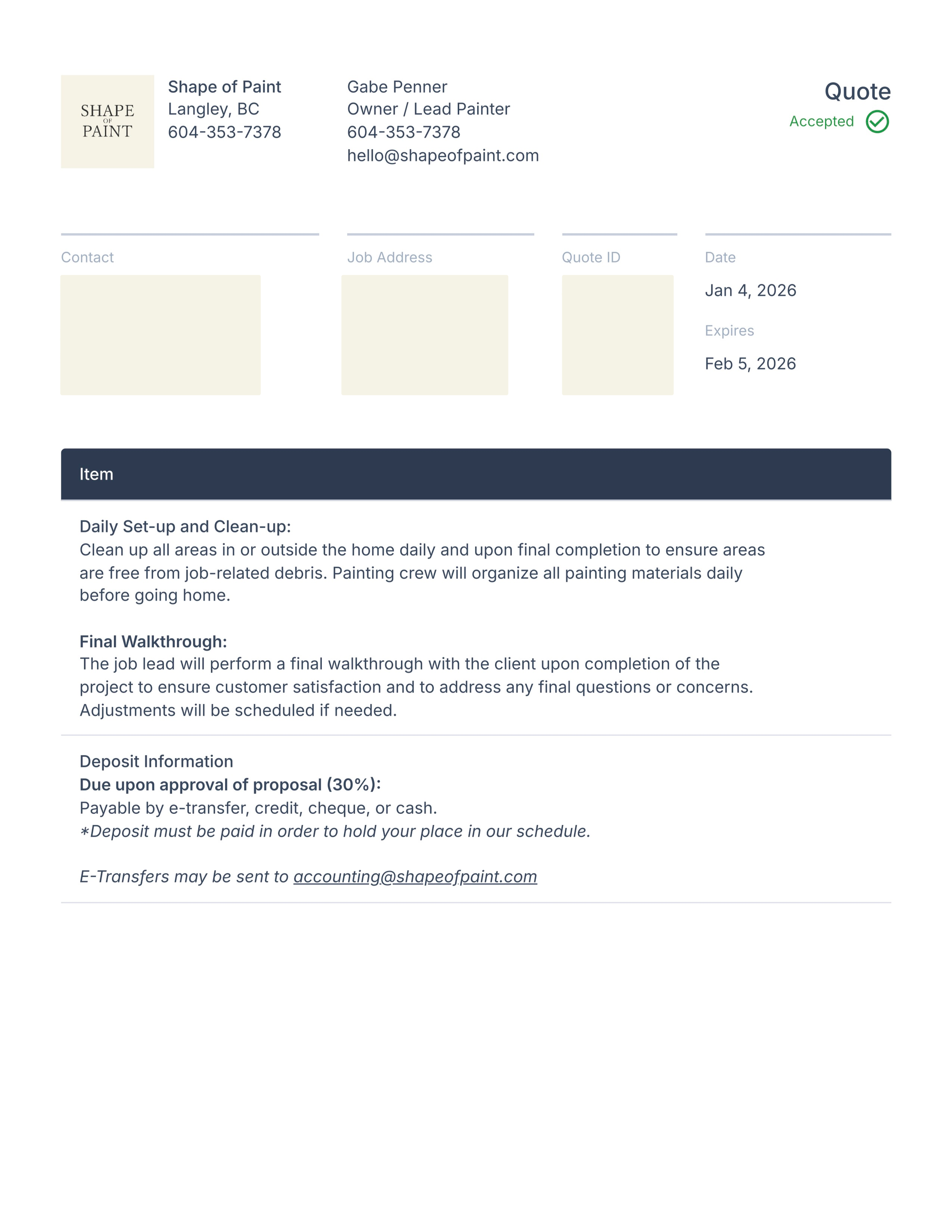 This redacted example of a cabinet quote shows how scope, preparation, protection and sequencing are defined upfront before a project begins.